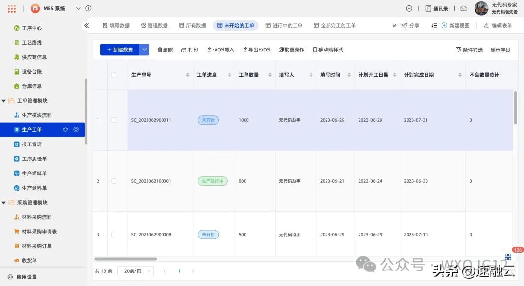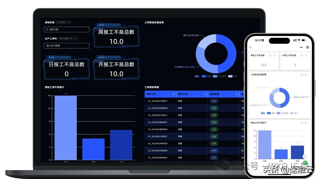 通过在无代码速融云搭建落地数字化生产管理系统,实现从原材料、生产报工、生产过程、质检、设备、仓库等整个业务流程的管理和控制,协助企业合理安排生产计划、实时监控生产、优化生产工艺、降低不良产出和运营成本,提升制造生产运营管理效率,实现精益生产。