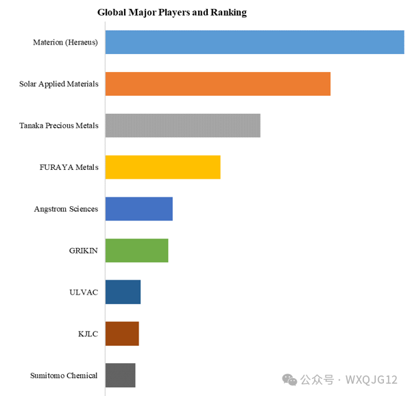 全球范围内高纯贵金属靶材生产商主要包括Materion (Heraeus)、Solar Applied Materials、Tanaka Precious Metals、FURAYA Metals、Angstrom Sciences、GRIKIN、ULVAC、KJLC、Sumitomo Chemical、等。2022年,全球前五大厂商占有大约43.8%的市场份额。目前,全球核心厂商主要分布在Materion、Solar Applied Materials等。