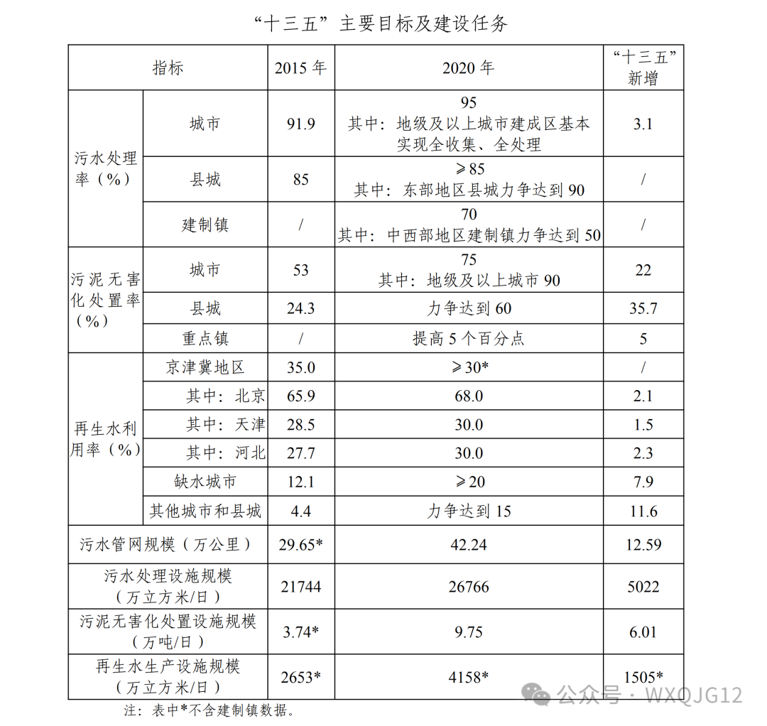 “十三五”期间规划新增污水管网 12.59 万公里,老旧污水管网改造 2.77 万公里,合流制管网改造 2.88 万公里,新增污水处理设施规模 5022 万立方米/日,提标改造污水处理设施规模4220 万立方米/日,新增污泥(以含水 80%湿污泥计)无害化处置规模 6.01 万吨/日,新增再生水利用设施规模 1505 万立方米/日,新增初期雨水治理设施规模 831 万立方米/日,加强监管能力建设,初步形成全国统一、全面覆盖的城镇排水与污水处理监管体系。