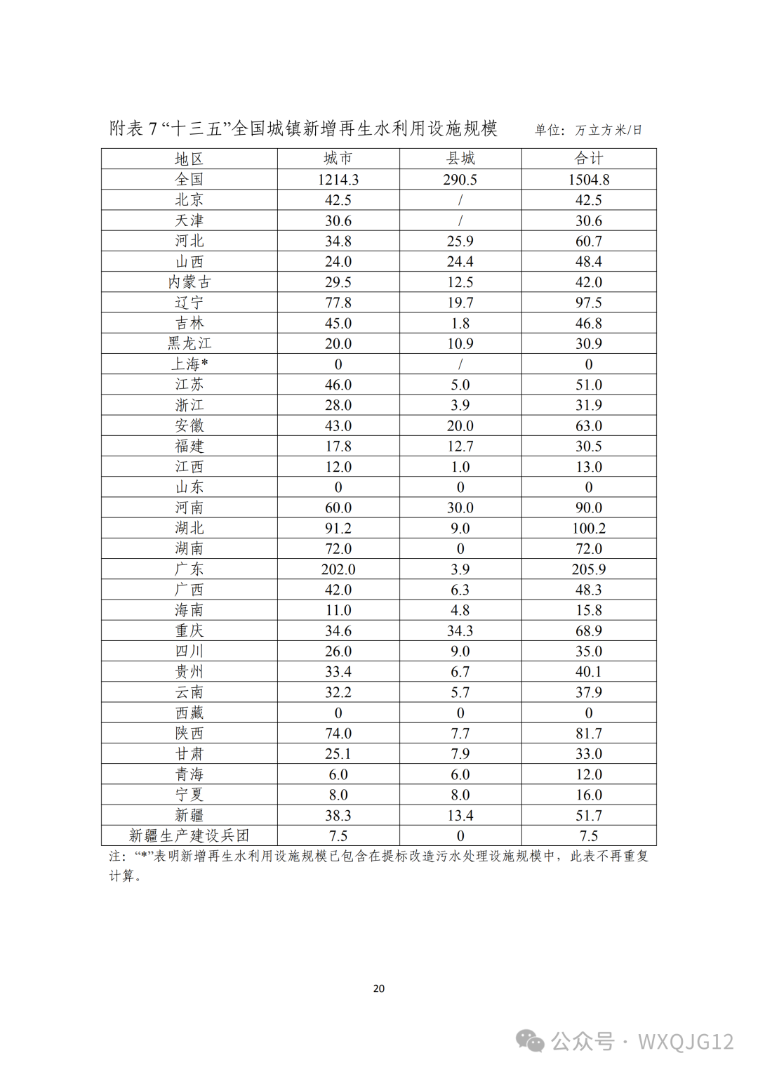 ——到 2020 年底,城市和县城再生水利用率进一步提高。京津冀地区不低于 30%,缺水城市再生水利用率不低于 20%,其他城市和县城力争达到 15%。