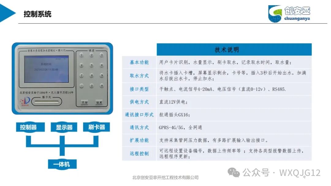 智能加水机系统产品说明:适用于再生水取水站、洒水车取水站、环卫加水点、管网末端配套设施,创安亚智能水务助力企业信息化,可视化!