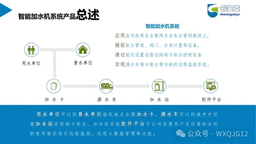 智能加水机系统产品说明:适用于再生水取水站、洒水车取水站、环卫加水点、管网末端配套设施,创安亚智能水务助力企业信息化,智能化!