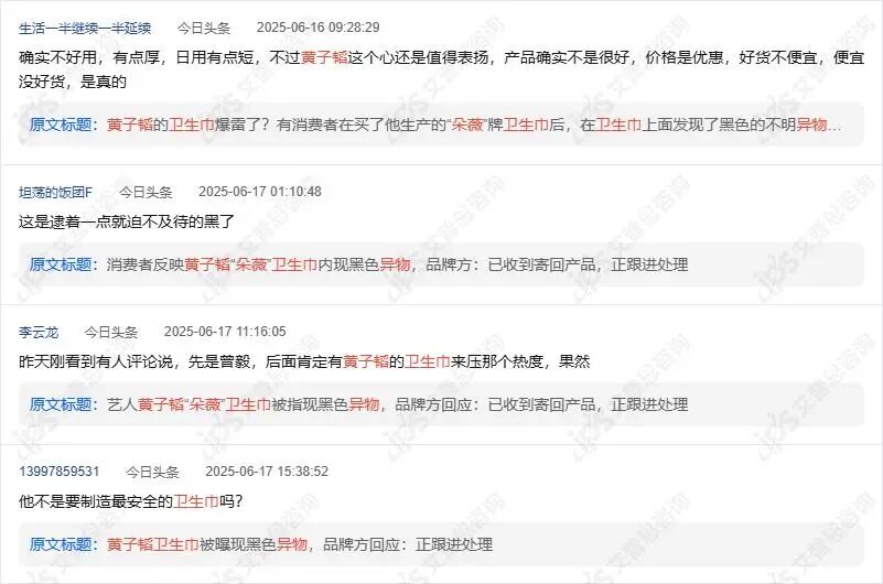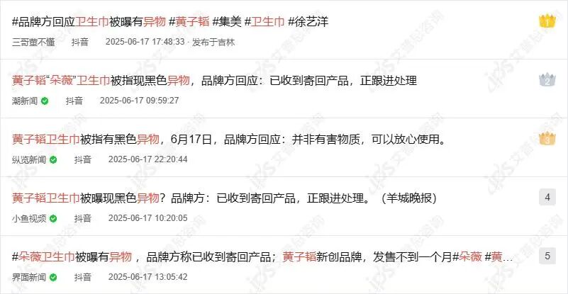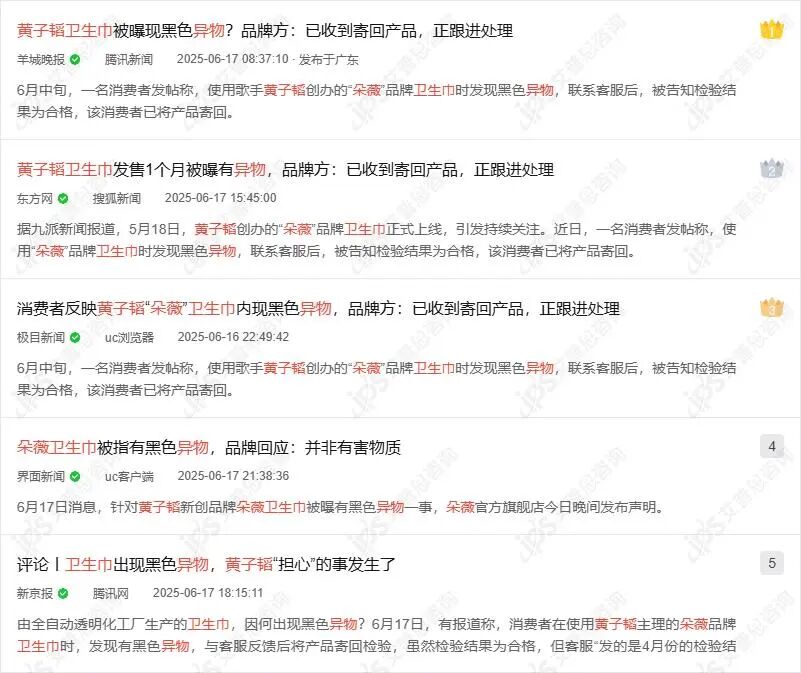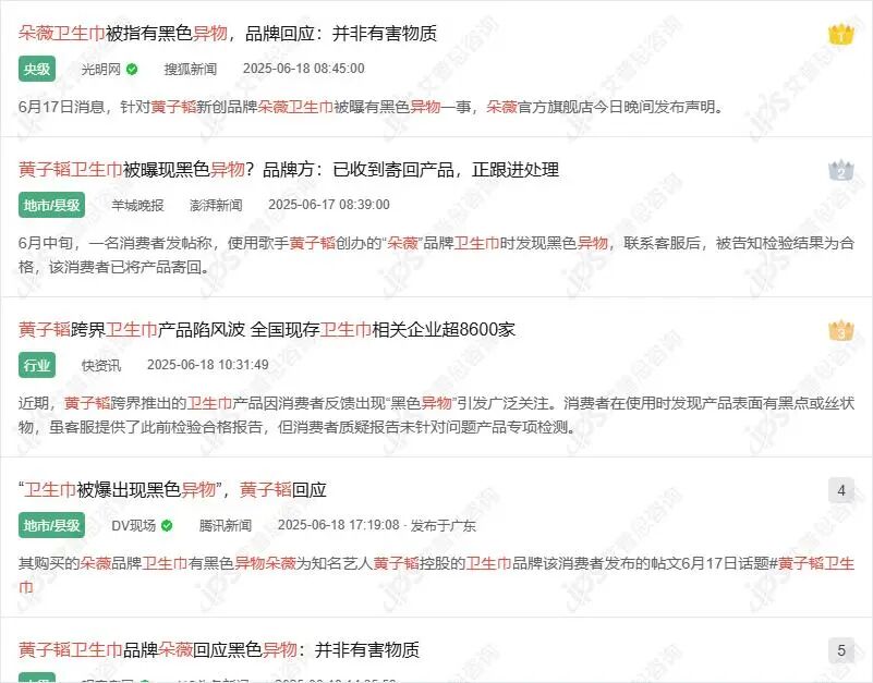 “黄子韬朵薇卫生巾现异物”事件中,代表性的媒体观点有搜狐新闻的【朵薇卫生巾被指有黑色异物,品牌回应:并非有害物质】及澎湃新闻的【黄子韬卫生巾被曝现黑色异物?品牌方:已收到寄回产品,正跟进处理】等,详情如下:
