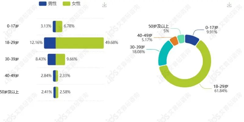 在微博平台中,女性用户对“黄子韬朵薇卫生巾现异物”事件参与度较高,占比71.03%,年龄主要分布在18-29岁之间;男性用户占比28.97%,年龄主要分布在18-29岁之间。