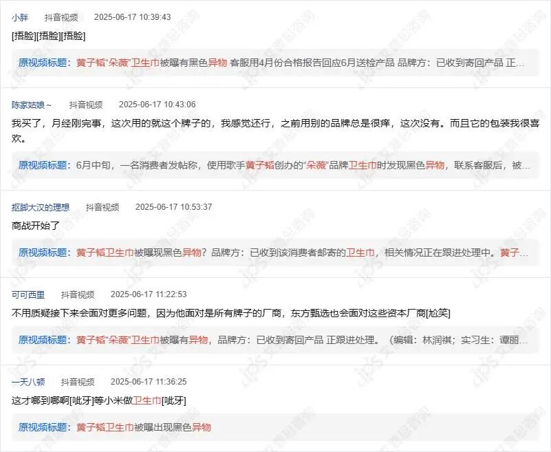 “黄子韬朵薇卫生巾现异物”事件中,短视频平台上代表性的网友观点有【 [捂脸][捂脸][捂脸]】及【 我买了,月经刚完事,这次用的就这个牌子的,我感觉还行,之前用别的品牌总是很痒,这次没有。而且它的包装我很喜欢。】等,详情如下:
