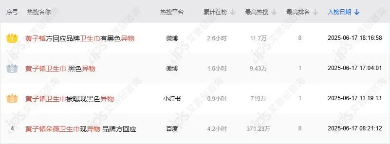 截止2025-06-19 16:03:27关于“黄子韬朵薇卫生巾现异物”事件的讨论,共产生4个热搜话题,分别出现在百度、微博、小红书等3个平台。其中,最早出现热搜话题是百度平台的【黄子韬朵薇卫生巾现异物 品牌方回应】,上榜时间是2025-06-17 08:21:12;在榜时间最长的热搜话题是百度的【黄子韬朵薇卫生巾现异物 品牌方回应】,持续4.25小时;排名最高的平台为微博、小红书,均为**位。