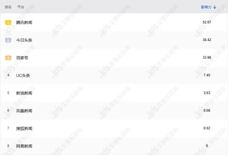 “黄子韬朵薇卫生巾现异物”事件中,腾讯新闻综合影响力数值为52.07,****;排名第二平台为今日头条,综合影响力数值38.42;排名第三平台为百家号,综合影响力数值33.96。