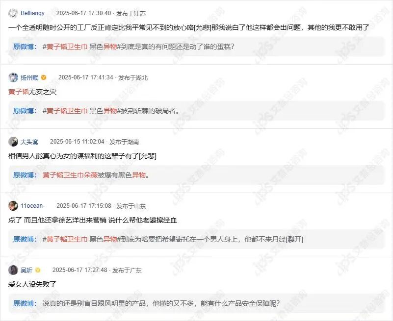 “黄子韬朵薇卫生巾现异物”事件中,代表性的微博网友观点有【 一个全透明随时公开的工厂反正肯定比我平常见不到的放心咯[允悲]那我说白了他这样都会出问题,其他的我更不敢用了】及【 黄子韬无妄之灾】等,详情如下: