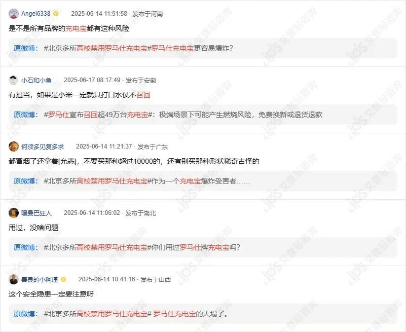 “罗马仕回应多所高校禁用其充电宝”事件中,代表性的微博网友观点有【 是不是所有品牌的充电宝都有这种风险】及【 有担当,如果是小米一定就只打口水仗不召回】等,详情如下: