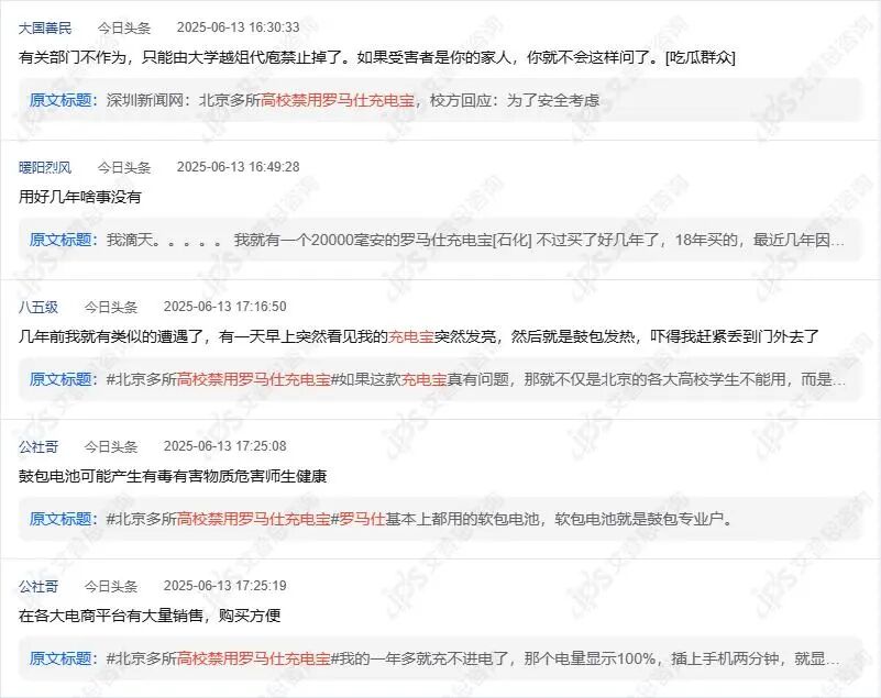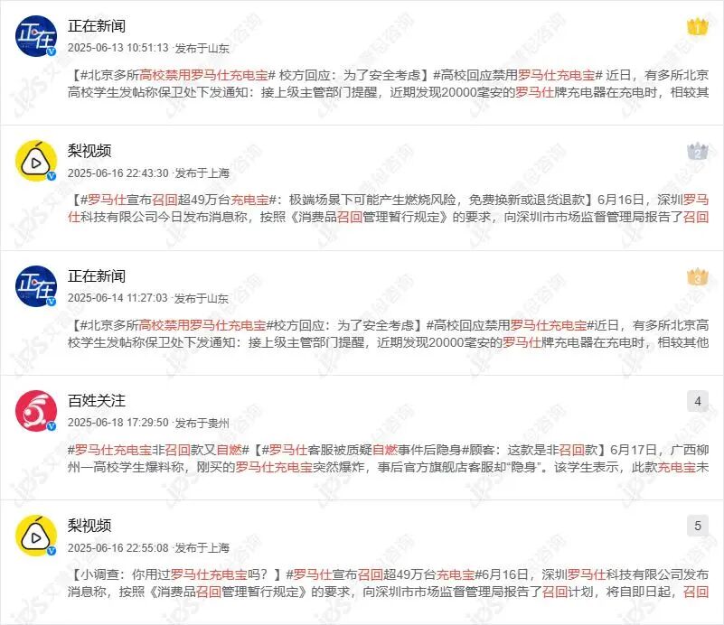 “罗马仕回应多所高校禁用其充电宝”事件中,代表性的媒体观点有正在新闻的【#北京多所高校禁用罗马仕充电宝# 校方回应:为了安全考虑】及梨视频的【#罗马仕宣布召回超49万台充电宝#:极端场景下可能产生燃烧风险,免费换新或退货退款】等,详情如下: