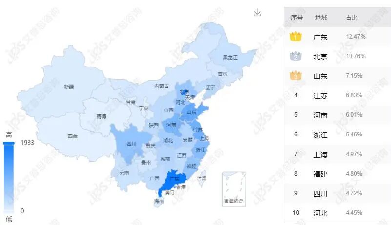 在“罗马仕回应多所高校禁用其充电宝”事件中,广东、北京、山东的媒体发文最多,占比分别为12.47%、10.76%、7.15%。