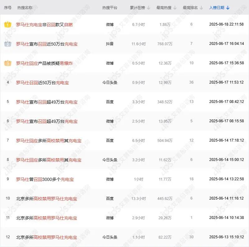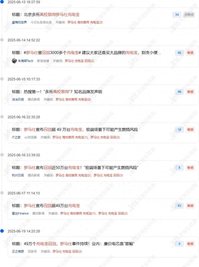 “罗马仕回应多所高校禁用其充电宝”事件报告数据监测时间范围是2025-06-13 00:00:00至2025-06-19 23:59:59,主要舆论场为新浪微博平台,主要媒体报道传播【紧急召回近50万台 这些型号的充电宝有自燃风险】,情感属性以敏感为主。