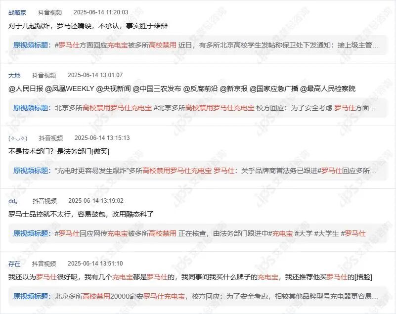 “罗马仕回应多所高校禁用其充电宝”事件中,短视频平台上代表性的网友观点有【 对于几起爆炸,罗马还嘴硬,不承认,事实胜于雄辩】及【罗马士品控就不太行,容易鼓包,改用酷态科了】等,详情如下: