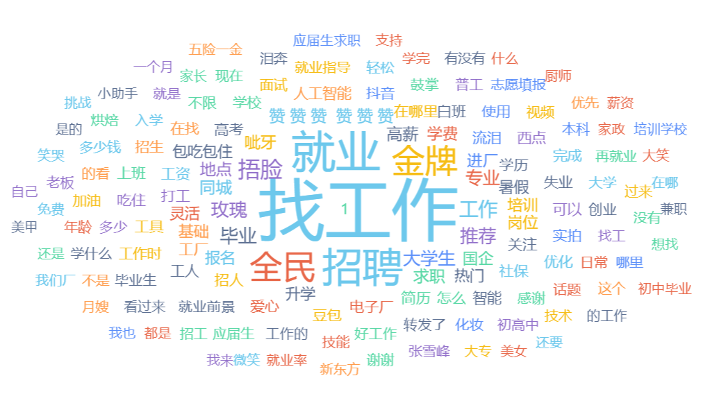 高频关键词包括:再就业、裁员、妈妈岗、灵活就业、直播招聘、技能培训、家门口就业、短视频带岗、电商平台、企业招聘、薪资压缩、劳动权益、青年就业、毕业生冲刺、平台经济、社保保障等。