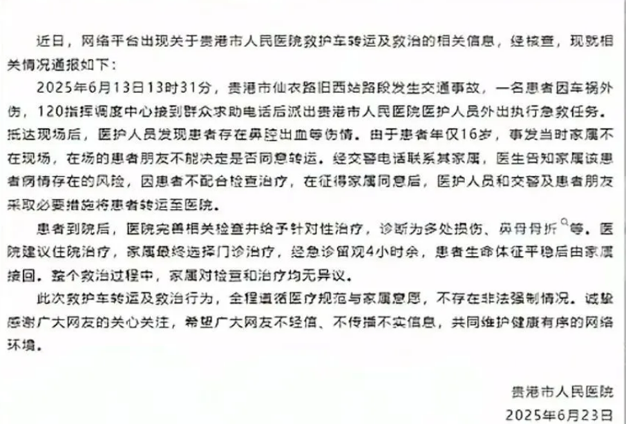 2025年6月23日,网络平台出现相关视频,称“广西贵港一年轻女子在街上被救护车强行拖走”,配以视频画面,迅速引发关注和争议。当天,贵港市人民医院发布情况通报,详细还原事件全过程,澄清不存在非法强制,并呼吁理性看待事件,不信谣、不传谣。