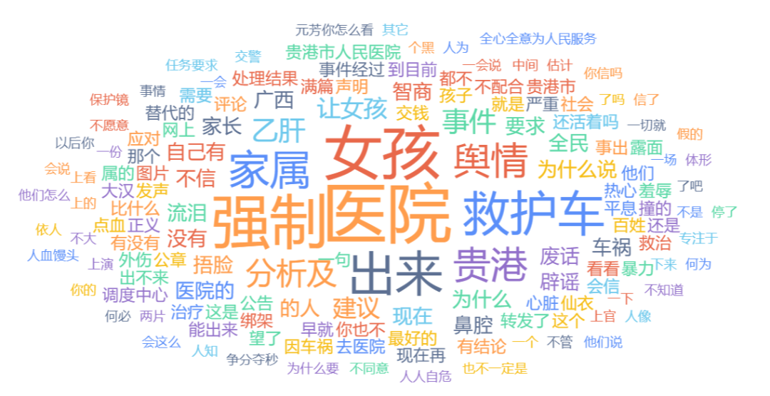 关键词高频出现有“强行”、“救护车”、“家属同意”、“16岁女孩”、“非法强制”、“医护人员”、“交警”、“诊疗流程”、“情况通报”等。