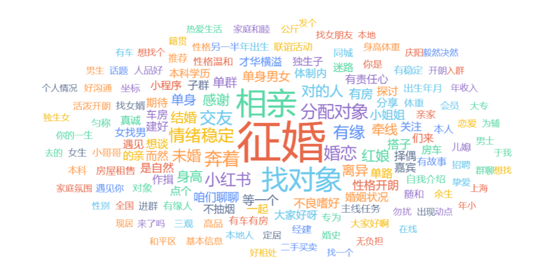 高频关键词包括:单身、恐婚、结婚难、离婚率、相亲、经济压力、社恐、婚恋观、缘分、现实压力等。